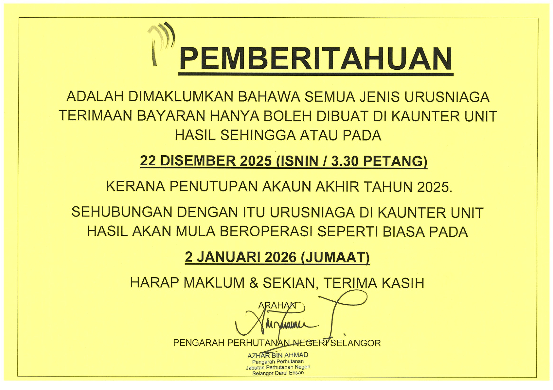 PEMBERITAHUAN PENUTUPAN KAUNTER UNIT HASIL